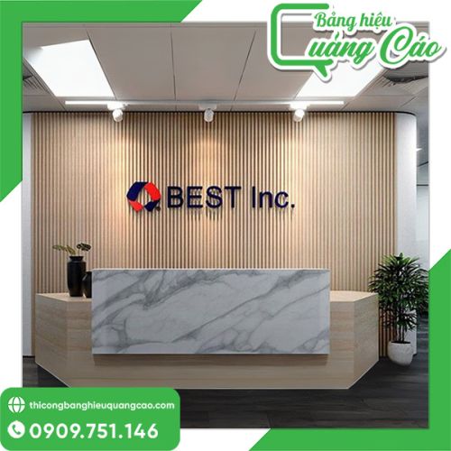 - Đặc điểm: Thường kết hợp với các loại nền cao cấp như đá, gỗ, kính. Điểm nhấn chính là bộ chữ, logo được gia công từ inox (thép không gỉ) với các bề mặt như inox xước, inox bóng gương, inox vàng/trắng.